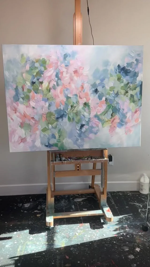 Planted by the Waters is a 48x48 abstract painting inspired by the lush beauty of nature. Vibrant layers of turquoise, greens, and pinks flow together with expressive strokes of pastel, creating a sense of energy and calm. The textures and details bring a sense of depth and movement, making this piece a striking addition to any space.
